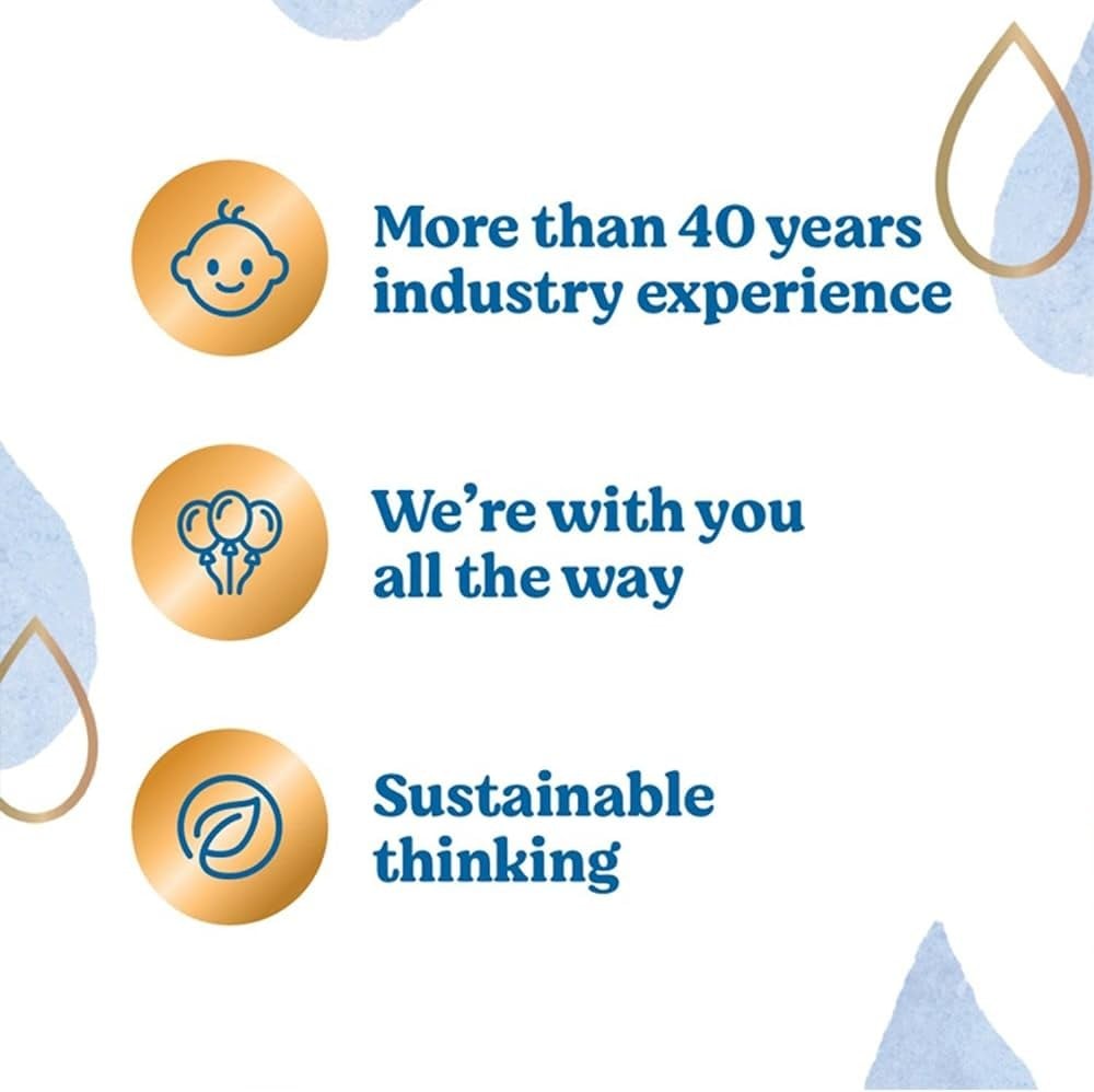 مصنوعة من ألياف طبيعية بنسبة 71% (لب الخشب) وغنية بنسبة 99% من الماء ومكونات أساسية محبة للبشرة، مناديل مبللة لطيفة بما يكفي لتنظيف بشرة طفلك الحساسة من اليوم الأول. مئات المناديل المبللة للأطفال