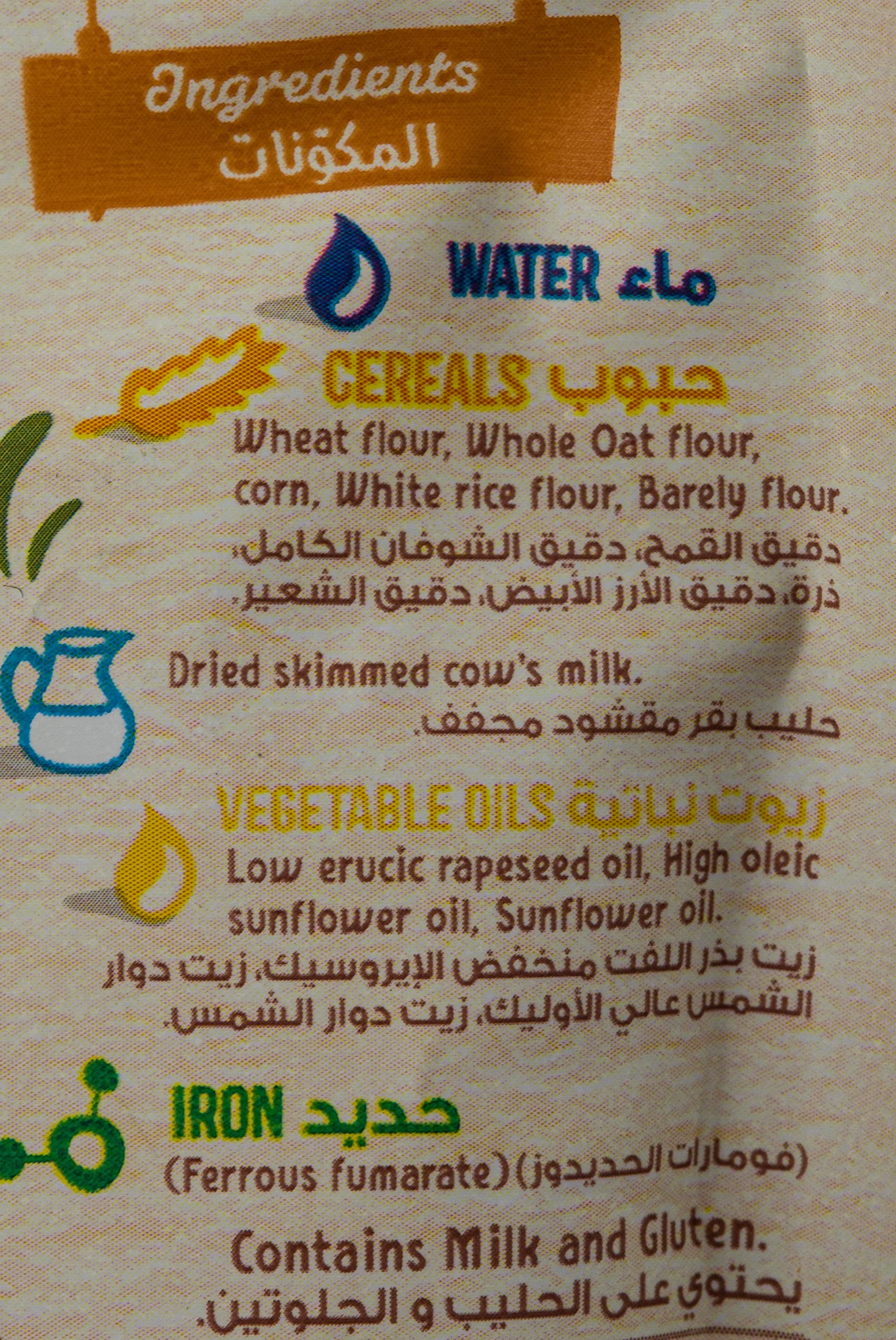 - ماء, حبوب,دقيق القمح، دقيق الشوفان الكامل، ذرة، دقيق الأرز الأبيض، دقيق الشعير,حليب بقر مقشود مجف,زيوت نباتية,زيت بذر اللفت منخفض الإيروسيك، زيت دوار الشمس عالي الأوليك، زيت دوار الشمس,حديد,(فومارات الحديدوز)